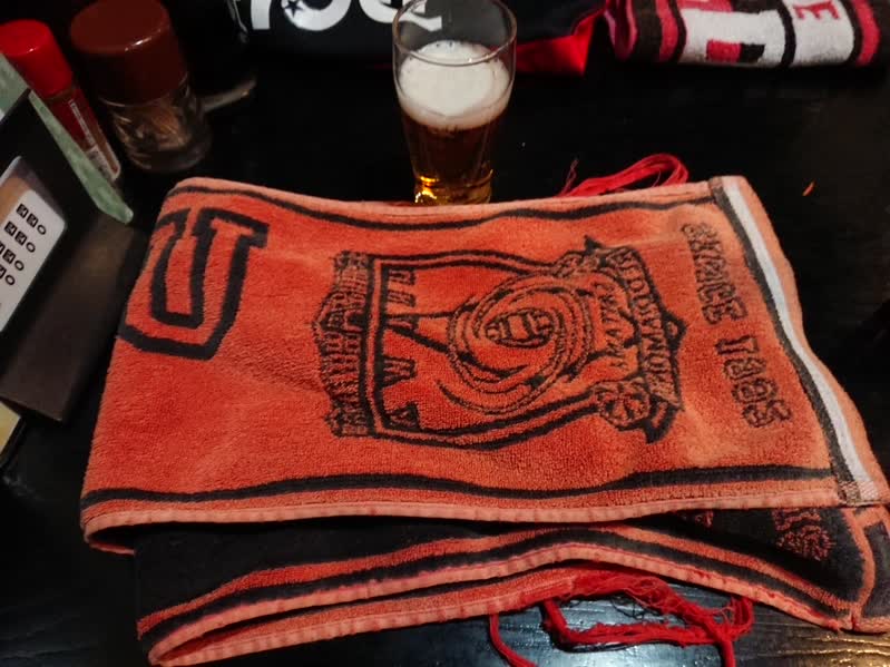 もう酷使し続けて端の糸は解れまくり、色褪せ過ぎてもはや赤から朱色になってしまい、アウェー名古屋戦では名古屋サポに間違えられた事もあった。更にこのまま色褪せたら、今度はオレンジ色になって隣のサポに間違えられてしまうかも。いやその前に糸が更に解れて、使い物にならなくなるのが先だったかもしれないが。
