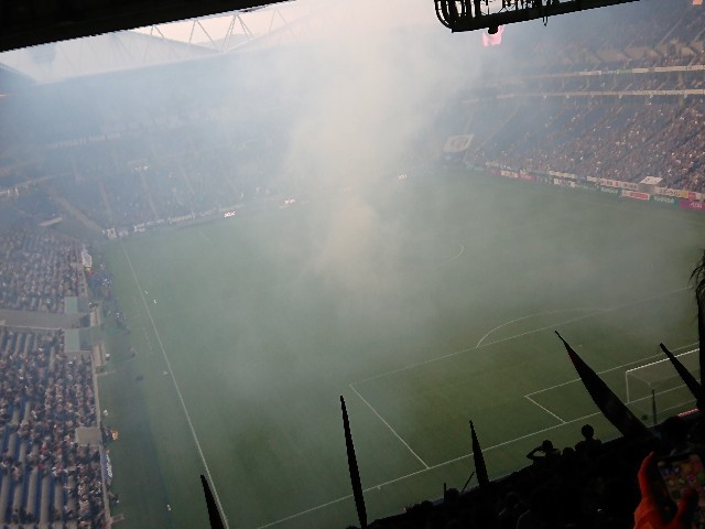 ガンバの運営さん、この只でさえ糞暑い時に、試合開始直前に、いくら自チームのスタメン発表を盛り上げたいとはいえ、ピッチのど真ん中でドッカンドカン花火を打ち上げないでください。うるせーし、煙いし、モヤるし、繰り返すけど只でさえ糞暑いのに、これで余計に暑っ苦しくなるし・・・。