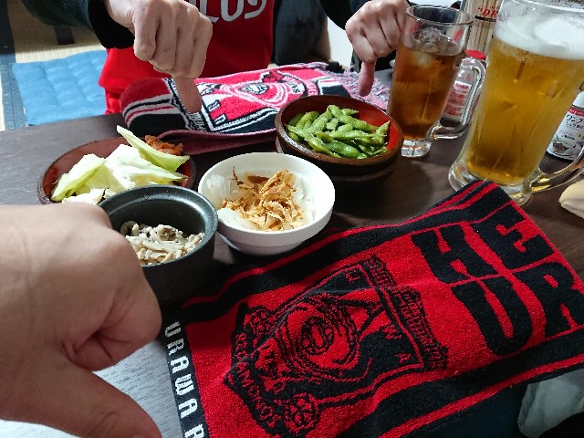 で、超テキトーというか、線路脇道から一歩入った裏路地に、途端に安くて良さげな店を見付けて入ったこの店で、席の隣の東京サポ夫婦と意気投合し、盛り上がりながら、お互いの健闘を讃えつつ、更に地元民と、やたら盛り上がってしまった・・・。