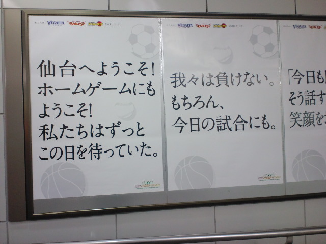 今回は試合観戦の他は少し仙台駅の周辺を歩いただけで帰って来ました。海沿いの津波被災地の1日も早い復興を祈っています。次のFM戦、また違うタイプの相手ですが、連敗は避けたいですね!頑張って後押ししましょう!お疲れ様でした。