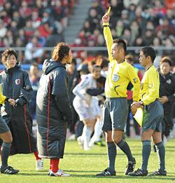 試合中は鹿島、広島双方からそれぞれ1人ずつを退場送りにし、さらに試合後も猛抗議の鹿島選手陣に大盤振る舞いのカード贈呈大会で、最後は大岩も(彼には後半にイエロー出してるのに1発レッドで)退場送りにする出血大サービス。ちなみにこれに対して鹿島サポもピッチ乱入で応える。