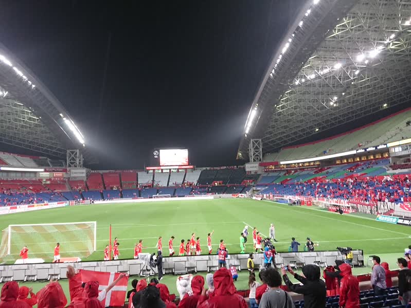 ああああ、昼間まで実に良い天候だったのに、開門時間が近付くに連れて嫌な雲が上空を覆って来ては雨は降って来るし、雨だけなら良いものを風も強くなりたまに横殴りの雨になるし、おまけに雷まで鳴る始末で、それがスタジアムに入って収まったと思って安心していたら、今度は選手ウォーミングアップが進むに連れてまたポツポツ来てはハウス・オブ・ラブ直前でバケツをひっくり返したような土砂降り。しかし奇跡かそれが試合開始直前に止んだと思ったら、今度は試合終了が近付くに連れてまたボタボタ降ってくるという、実にジメジメしたスタジアムであった。