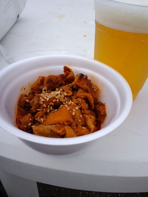 だいたい15時に南広場で開始のはずが、突如として16時に南門内へ変更なのに、15時に南広場は既に仮屋台で開店している上に誰も人が・・・。なのでビールセット買おうと近付いたら、若い男女の(多分韓国人)店員に辿々しい日本語で大歓迎され、5千円札を崩そうとそれを出したら「千円札のお釣りか無いんてす」(韓国の人が喋る日本語らしく濁点を抜いてみたよ)とか言い出す用意の悪さ。初っ端からズッコケ要素満載なのであった。