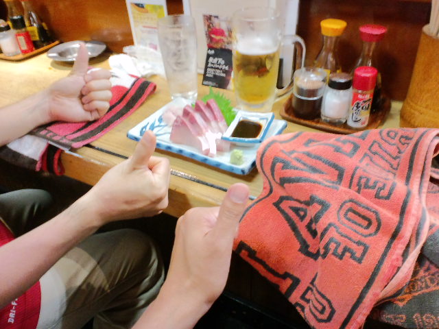 その大衆居酒屋、なかなか良かったのさ。ここの店員さん、関西のオバチャ~ンを絵に描いたような、お袋さん的な人が大量に居る店だった。カウンターと机数個しかないのに、そんなに店員が必要か?と超疑問な店だったんだけど、関西オバチャントーク炸裂しまくりで、みんな優しくて、店員からこの店の常連さん達や地元客の人から、皆さんに「優勝おめでとうさん」と祝ってもらって、ちょっと、いやかなり感動した。嬉しかった。ステージ優勝じゃ盛り上がらないと言っていたけど、神戸の人からも「おめでとうさん」と言われると、やはり何でも優勝は良いものだと思った。