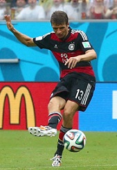 その蟻の入る隙も無いドン引き密集地帯に・・・何あれ、ミュラーのシュートは・・・。セットプレーのこぼれ球だったからアメリカゴール前で敵味方が余計に密集している所に、ミドルレンジから針の穴を通すようなレーザービームシュートが炸裂した。あの密集状態で誰にも触れられない上で、キーパーの指さえ届かない位置にあの威力で叩き込むって・・・。しかもそのミュラーはガーナ戦の接触プレーで流血して、右眼のこめかみに傷を負って幾らか視野が狭まっているのに、それでもあの超高精度シュートを放てるなんて怪物か・・・。