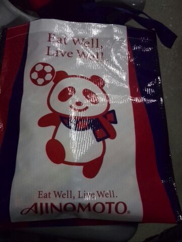 その味の素さん、ビジターの自分らにまで商品をくれるのは有難いし、それを入れてくれている手提げの片面アジパンダはまだ良いんだが・・・。